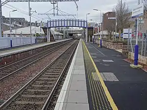 Monday to Saturday there are 4 trains per hour to Edinburgh Waverley eastbound and 2-3 trains per hour westbound to Dunblane via Stirling. Train times to Edinburgh Waverley vary from 25 minutes to 34 minutes; faster trains stop at Edinburgh Park and Haymarket, slower trains additionally stop at Polmont and Linlithgow. There are also 2 trains per hour to and from Glasgow Queen Street via Cumbernauld, with journey times from 39 minutes to 43 minutes. There is also a single weekday morning peak direct service to Glasgow which originates at Kirkcaldy; this returns to Markinch in the evening, with an evening journey time of 26 minutes.[7] London Northern Eastern Railway operate one train per day to Stirling, one train per day to Inverness and two trains per day to London King's Cross. Glasgow services were diverted via Cumbernauld (rather than their former routing via Croy) in September 1999[8] in order to free up paths on the busy E&G main line.