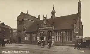 Fallowfield railway station is a disused station that is located on Wilmslow Road in Fallowfield, a southern suburb of Manchester, England. It was on the Fallowfield Loop railway line, a suburban railway which looped around the south of the city and terminated at the former Manchester Central railway station.[1] The station closed to passengers in 1958, but its building still stands on the corner of Wilmslow Road and Ladybarn Road.