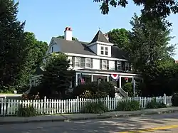The town of Falmouth was settled in about 1660, but was not set off from Barnstable until 1686. Its first town center was about 0.75 miles (1.21 km) south of the present green, and the 1756 relocation of the meeting house to this area was the subject of much debate. This move spurred the construction of houses along what is now Locust Street, which connected the new center to the south coast, and adjacent to the meeting house, where seven houses survive from that period.[2] Of particular note are the Museums on the Green,[3] owned and operated by the Falmouth Historical Society, with two historic houses and an exhibit center presenting the history of Falmouth, in a setting of gardens by the Falmouth Garden Club. The First Congregational Church, built in 1796, was originally located on the green, but was moved to its north side in 1858. Its belfry houses a bell manufactured by Paul Revere. The green continues to be a major gathering place for civic functions.[2]