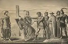 Then they brought the prince Alfonso to the platform, and proclaimed him king, yelling "Castile, by King Alfonso!" and proceeded with the hand-kissing ceremony.[3]