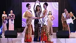 Nariswari when crowned as the winner of Puteri Indonesia 2023 by her predecessor Laksmi De-Neefe Suardana and Putri Kuswisnu Wardani as Chair of the Puteri Indonesia Foundation, on 19 May 2023.