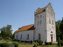 The construction material of the church is whitewashed fieldstone, while the corners and other details are made of sandstone. The windows date from the 1870s, when the considerably smaller, medieval windows were replaced. Internally, the ceiling is supported by medieval vaulting which has been heavily restored during the 19th century. In the apse, behind the altar, murals from the 14th century were uncovered during a renovation in 1953. During the same renovation, the church also received new pews, flooring and a new altar. The altarpiece however is from the 18th century. Of even earlier date is the pulpit, dated 1626 and similar to others in churches in the vicinity of Helsingborg. The organ is from 1916. The church bell is from 1636 and was made in Helsingborg.[1]
