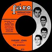 Featuring brothers Lawrence Perez on lead guitar and John Perez on drums, the Premiers were established as many garage rock bands were, practicing in their garage. The group had the opportunity to record "Farmer John" when the mother of the brothers arranged an audition with record producer Billy Cardenas, who was instrumental in promoting several Chicano groups.[5] As Lawrence Perez recalled, Cardenas recommended to the Premiers to cover "Farmer John", saying "He wanted to do it more East L.A.-style, or 'Louie Louie'-type. At the time, the 'Louie Louie'-type rhythm and sound was happening, so we tried to base the beat and sound towards that".[6] As it so happens, "Louie Louie", had like "Farmer John" begun as a single released by a Los Angeles-based African-American R&B musical act (in this case Richard Berry), before the Kingsmen's classic rendition propelled to number two on the Billboard Hot 100. For that reason, the Premiers' cover was marked by the same kind of unpolished adolescence that garnered the Kingsmen national success.[6][7]