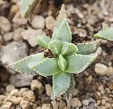 Faucaria felina, tiger jaws (a name it shares with Faucaria tigrina), is a species of succulent plant in the family Aizoaceae. It is endemic to the southern Cape Provinces of South Africa, but also widely spread in culture. It has a clumping habit and blooms with yellow flowers.[2] As its synonym Faucaria candida, white tiger jaws, it has gained the Royal Horticultural Society's Award of Garden Merit.[3]