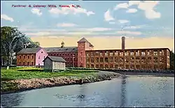 The main building was constructed in 1838 and was subsequently expanded in 1859.[3] The mill was named after Francis Faulkner and Josiah Colony, who owned multiple mills along the Ashuelot River.[3] In addition to the main mill building, a former boarding house (built 1810) and a storehouse (built 1859) are included in the NRHP listing.[3] The mill provided material for many uses, including to the U.S. military during the Civil War, World War I, and World War II.[3]
