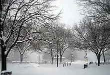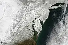 The February 9–10, 2010 North American blizzard was a winter and severe weather event that afflicted the Midwest, Mid-Atlantic and New England regions of the United States between February 9–11, 2010, affecting some of the same regions that had experienced a historic Nor'easter three days prior. The storm brought 10 to 20 inches (25 to 51 cm) of snow across a wide swath from Washington, DC to New York City, with parts of the Baltimore metro area receiving more than 20 inches (51 cm).[1] This storm began as a classic "Alberta clipper", starting out in Canada and then moving southeast, and finally curving northeast while rapidly intensifying off the New Jersey coast, forming an eye. The National Weather Service, in an interview with The Baltimore Sun's weather reporter Frank Roylance, likened this storm to a Category 1 hurricane. Forecasters told Roylance that "Winds topped 58 mph over part of the Chesapeake Bay, and 40 mph gusts were common across the region as the storm's center deepened and drifted slowly along the mid-Atlantic coast".[2] This storm system, in conjunction with the first storm 3 days prior, has been nicknamed Snoverkill.
