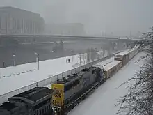 Blizzard conditions in Philadelphia on February 10. 30th Street Station and Cira Center barely visible from Walnut Street.