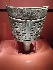 The Feijiahe culture was marked by a "flourishing bronze industry" which produced ding cauldrons, nao bells, zun, and possibly you vessels. These bronzes showed significant differences to bronze objects produced in the Central Plains at the time, with animal motifs and forms such as nao and zun being more uncommon further north.[4] In addition, the culture differed in regards to where the objects have been found: Whereas bronzes of the Central Plains were mostly associated with graves, Feijiahe culture objects are often found in pits or on mountaintops.[6] As a result, bronze objects of the region including those of the Feijiahe culture are difficult to date, as they are often found in relative isolation.[10] However, bronze remained a scarce commodity for the culture; in contrast, pottery was produced in much greater numbers and played a much more important role.[3] Large amounts of glazed and unglazed ceramics were unearthed at Feijiahe culture sites; these are distinct from other regional ceramic traditions such as those in Jiangxi.[8] However, the exact usage and roles of many ceramic objects remains unclear.[3]