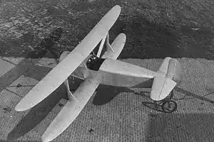 The Feiro Dongó was the second design of Lajos Rotter in his collaboration with the brothers Gyula and László Feigl.[1][2] Rotter aimed to produce a training aircraft of high aerodynamic refinement with a high lift to drag ratio (L/D) which was also stable but responsive to the controls, structurally strong, easy to land and with a good all-round view from the cockpit. An innovative wing design was a key feature. The Dongó was a biplane with wings of very high aspect ratio and modified elliptical plan, thus minimising induced drag. The upper wing had an aspect ratio of 16.9, very high at the time,[3] and both wings had a root chord of only 800 mm (31.5 in), though the lower was 1.0 m (3 ft 3 in) shorter.[2] Both had thick airfoils.[4] The very narrow wings were claimed to provide longitudinal stability, as the centre of pressure could not move far,[3] and further pitch stability was provided by heavy stagger, with the lower wing 600 mm (23.6 in) behind the upper.[2] The two wings were set at different angles of attack, 0° on the lower and 2° on the upper, again with the intention of improving longitudinal stability To provide roll stability the upper wing had dihedral beyond a short centre section. The latter was supported by a steel tube cabane which had pairs of vertical, kinked struts, faired in the upper part, and a forward, transverse inverted-V, all joined to the upper fuselage. This structure made it possible to vary the upper wing's angle of incidence and the stagger.[3] The wings were 3-ply covered, two spar structures. High aspect ratio, metal covered ailerons were mounted on the lower wings.[2]