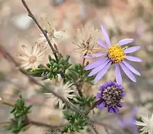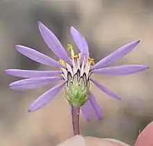 The flower heads are on the short shoots or at the tip of the long shoots, medium-sized, seated or on up to 10 cm (3.9 in) long stalks. The involucre is 6–8 mm (0.24–0.31 in) in diameter, and consists of three to four whorls of bracts. These bracts are overlapping, lance-shaped, hairless, tawny to greenish in colour with the tip often tinged red. They have a papery margin more or less set with a regular row of hairs. The outer bracts are 1½ mm (0.06 in) long and ½ mm (0.02 in) wide, those in the middle 3 mm (0.12 in) long and 1 mm (0.04 in) wide, and the inner 5 mm long and ½ mm wide. Each head has ten to fifteen female, medium or light purple, rarely white, ray florets of about 1 cm long and 1½ mm wide. These surround numerous bisexual yellow, later burgundy-washed disc florets of 4–6 mm (0.16–0.24 in) long. The two style branches each have a long triangular appendage. The pappus bristles are numerous, yellowish white in colour, and do not detach. Although they vary in length, they do not occur in two distinct rows. The longer pappus bristles have teeth along their length and are 5–7 mm (0.2–0.28 in) long, the shorter scaly and ½–1 mm (0.02–0.04 in) long. The dry, one-seeded, indehiscent fruits called cypselae are obovate to elliptic, about 4 mm (0.16 in) long and 1½ mm (0.06 in) wide, evenly silky hairy, with a brownish scaly surface when mature, and a light ochre-coloured marginal ridge.[4]