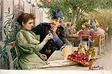 Myrbach was elected to the Secession's committee in 1899,[15] contributed mosaics for the 1902 Beethoven Exhibition, and served as the Secession's president in 1903. He was close to Gustav Klimt, and was part of the 'Klimt Group' that left the Secession in 1905. Ludwig Hevesi called Myrbach "probably the best [illustrator] in Vienna", partially for his work (with Moser) in the Secession magazine Ver Sacrum.[16]