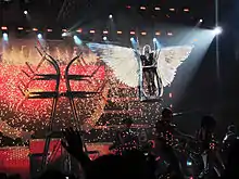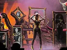 On June 16, 2011, Spears embarked on her sixth concert tour to further promote Femme Fatale. It was announced on March 29, 2011, and included forty-five shows in North America and twenty-six in Europe.[69] In an interview on Ryan Seacrest's radio show on March 4, 2011, Spears stated she would tour the United States in the "early summer" in support of Femme Fatale.[70] On March 29, 2011, following her performances on Good Morning America, she announced a co-headlining tour with Enrique Iglesias, starting in June 2011. Hours after the announcement, it was reported by Billboard that Iglesias had pulled out of the tour. Ray Wedell of Billboard speculated that the reason may have been that Spears was deemed by news outlets as the headliner, while Iglesias was considered the opening act.[71] The first twenty-six North American dates were also announced on March 29, 2011.[72] The opening acts were announced on April 12, 2011. Spears stated: "This is the Femme Fatale tour and I'm thrilled to have Nicki Minaj, Jessie and the Toy Boys, and Nervo join me and get everyone on the dance floor. Can't wait to take the Femme Fatales on the road." Tickets for select markets go on sale beginning April 30 at Ticketmaster and Live Nation's websites.[73] In March 2011, Spears's manager Larry Rudolph told MTV News that the tour would have a "post-apocalyptic vibe", while commenting that "Till the World Ends" keeps becoming a theme for us." He also announced Jamie King as the tour director.[74] The tour opened to positive reviews, with some calling it her best tour in her entire career.[75]