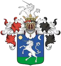 In 1739 he married the illustrious noble lady Anna Mária Rosty de Barkócz (1722-1784), daughter of László Rosty de Barkócz (fl. 1710-1730), chief magistrate (Hungarian: főszolgabíró) of the Vas county, landowner and Mária Csapody de Zalalövő (fl. 1710-1714). Her paternal grandparents were István Rosty de Barkócz (fl. 1691–†1718), administrator of the lands (Latin: bonorum prefectus) of the counts Batthyány, landowner, and Regina Jobbágyi de Vasjobbágy (fl. 1691–1694). Her maternal grandparents were István Csapody de Zalalövő (fl. 1663–1702), captain of the fortress of Zalalövő, landowner and Zsófia Perneszy de Osztopán (fl. 1651–1702), member of the ancient Hungarian noble family Perneszy de Osztopán. Zsófia Perneszy was the daughter of II. Stephen Perneszy (†c.1651), captain of the fortress of Zalalövő, landowner, and Susanna Rauch de Nyék (fl. 1657). Among the ancestors of Anna Rosty were the noble families Both de Bajna, Pogány de Cséb, Bánffy de Alsólendva, Rauch de Nyék, Paksy de Pákos, Török de Enying and Batthyány de Németújvár.
