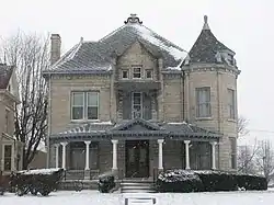 Ferguson House, also known as the Dr. Robert A. Brewer House, is a historic home located at Logansport, Cass County, Indiana. It was erected about 1895, and is a three-story, Romanesque Revival style brick dwelling sheathed in Indiana limestone. It features projecting bays and a 2+12-story round tower with conical roof, a one-story porch supported by Doric order columns, and a steeply pitched roof.[2]:2