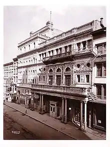 The theatre was built in 1868 and was originally named Gilsey's Apollo Hall, in 1870 renamed the St. James Theatre. Its capacity was approximately 1,530 seats.[1][2] In its early years, it offered lectures in the upstairs hall and musical entertainment in the main auditorium. When Augustin Daly's former Fifth Avenue Theatre (on 24th Street) burned down in 1873, Daly moved his company to the St. James, remodeled it and renamed it the New Fifth Avenue Theatre, where he continued as proprietor until 1877.[3] The 1873 financial panic hurt business at the theatre in Daly's early years, but his 1875 production of The Big Bonanza was a big success, as was his production of Lemons.[4] Mary Anderson and Helena Modjeska made their New York debuts at the theatre.[5] Eleonora Duse also made her American debut at the theatre in 1893 in The Lady of the Camellias.