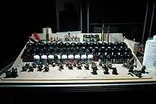 As acrylic paints began to become more widely available, companies began making acrylic paints that were formulated specifically for figure painting, characterized by being thinner than artist acrylic paints, with more flow, and having higher pigment density and more finely ground pigment than cheaper craft acrylics.[18] These include companies that only make paints and paint related products, such as Acrylicos Vallejo's Model Color and Game Color lines, companies that make paints to supplement gaming model lines, such as Games Workshop's Citadel Colour paints, and companies that make paints to supplement display model lines, such as Scale75's Scalecolor paints. Thin medium acrylic paints are most common, however some companies also make gel consistency medium based acrylic paints, such as Warcolour paints. The major benefits of acrylic paints over enamel paints are the faster drying time, that acrylics can be thinned with water, that various mediums and additives (eg retarders, surfactants, etc) can be mixed in to assist in painting, that multiple thinned and semi-transparent layers of paint can be used to create blending and effects, and being non-toxic.[17] For all of their advantages, acrylic paints are the most popular choice among figure painters, with the majority of painters, particularly display and competition painters, using exclusively acrylic or mostly acrylic with some other paint types used for achieving specific effects, although some figure painters still use enamels out of personal preference or nostalgia. As well as acrylic paints formulated for figure painting, it is possible to use regular "heavy body" acrylics to achieve highly detailed results, provided they are of a high artist grade quality.