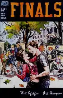Finals is a four-issue mini-series published by DC under its Vertigo imprint from September to December 1999. Written by Will Pfeifer and illustrated by Jill Thompson, it is a black comedy about campus life at Knox State University, aka KAOS U, where the maxim "Strength Through Study" is taken very much to heart.