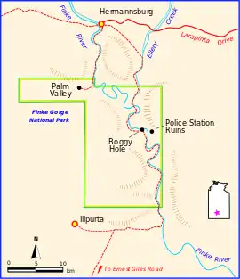 Finke Gorge National Park is a protected area in the Northern Territory of Australia located about 1,318 kilometres (819 mi) south of the territory capital of Darwin.[5] The national park covers an area of 458 km2 (177 sq mi), and includes the desert oasis Palm Valley, home to a diverse range of plant species, many of which are rare and unique to the area. There are good opportunities for bushwalking and bushcamping in the national park.[6]