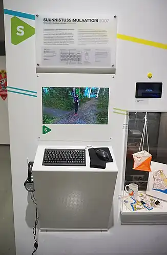 Among interactive stands there is a stand of the 3D cooperative sports video game Suunnistussimulaattori (lit. 'Orienteering Simulator'), where museum visitors could make a virtual trip to observe landscapes of Finland running with virtual orienteering map and compass.[11][12] This game has been used by Finnish and other orienteering athletes for virtual training (as an alternative to Catching Features), but development of this game stopped in 2016.[13][14][15][16][17] Also on the Suunnistussimulaattori stand behind the glass there are real orienteering sport equipment and game souvenirs, presented to museum by Antero Pulli, developer of the original game and Finnish orienteering athlete.[18][19]