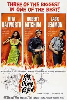 Fire Down Below is a 1957 British-American adventure drama film with a screenplay written by novelist Irwin Shaw, starring Rita Hayworth, Robert Mitchum and Jack Lemmon, and directed by Robert Parrish. Based on Max Catto's 1954 novel with the same title, the picture was made by Warwick Films on location in Trinidad and Tobago, in Technicolor and CinemaScope, and released by Columbia Pictures.