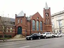That original structure was torn down and a new church building completed in 1900. It was designed in the Romanesque Revival style. The initial design was by architect A.G. Bauer, but Bauer's health problems caused the project to be turned over to architects Charles E. Cassell and Charles Pearson.[2] The sanctuary has been extensively remodeled twice, in 1955 and 2012.[3][4]