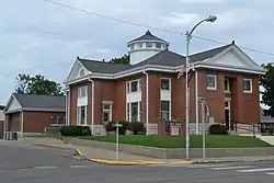 It is a two-story brick building. Its sanctuary has an unusual "corner pulpit from which four aisles radiate reminiscent of early 'meetinghouse' styles. It rises two stories with a curved balcony surrounding the rear sides of the sanctuary. All millwork and furniture are of oak. The plank floors are white pine."[2]