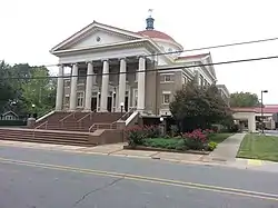 First United Methodist Church is a historic Methodist church at the junction of Prince and Clifton Street in Conway, Arkansas. It is a two-story brick building with Classical Revival style, set on a raised foundation. The building is basically rectangular in shape, but its main roof is cruciform, with gables on all for sides, and a dome at the center. The front has a fully pedimented six-column Classical portico, with an entablature and dentillated pediment with a small round window at its center. The church was designed by George W. Kramer of New York City, and built in 1913 for a Methodist congregation founded in 1871.[2]