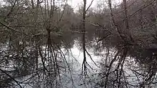 Fishpond Wood lies adjacent to Warren Farm, and its wetlands are surrounded by old oak-hazel woodland.[14] Around half of the hazel trees in the wood have been managed by coppicing again, although recent regeneration has been poorer, possibly owing to increasing numbers of rabbits and the arrival of muntjac deer.[15] The ponds support a range of amphibians, including frogs (numbering around a thousand), toads and newts, as well as dragonflies and damselflies during the summer months.[16]