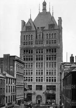 The Fiske Building, located in Boston, was a 38.1 m (125 ft)[1] skyscraper built by Peabody and Stearns in 1888 and demolished in 1986.[2][3] In 1964, five stories were added to the building, and the facade of the building was altered with the addition of glass, black aluminum strips and horizontal blue panels, which resulted in "serious architectural" observers calling the building "one of the ugliest in Boston".[2][4]