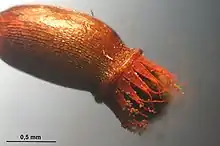 A sporophyte is the diploid multicellular stage in the life cycle of a moss which produces spores. They are commonly observed in this species. There is one sporophyte produced per perichaetium.[3] The seta, which is a stalk that supports capsule, is relatively short and is 25 mm in length. It is red-brown in colour and inserted laterally.[5] The operculum (lid) is about the same length as the rest of the sporangium.[5] The capsule of the sporophyte is inclined, curved, bilaterally symmetric and about 1.5 mm.[3] As for the calyptra, it is cucullate, smooth and about 2.5 mm. [3] The spores are about 3-22 µm.[3]