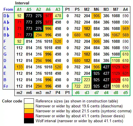 - 1 2 Wolf intervals are operationally defined herein as intervals composed of 3, 4, 5, 7, 8, or 9 semitones (i.e., major and minor thirds or sixths, perfect fourths or fifths, and their enharmonic equivalents) the size of which deviates by more than one syntonic comma (about 21.5 cents) from the corresponding justly intonated interval. Intervals made up of 1, 2, 6, 10, or 11 semitones (e.g., major and minor seconds or sevenths, tritones, and their enharmonic equivalents) are considered dissonant even when they are justly tuned, thus they are not marked as wolf intervals even when they deviate from just intonation by more than one syntonic comma.