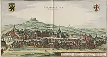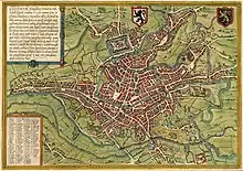 From 1632 Sanderus began with the first studies for his work. In 1634 he signed a contract with Hondius. After some time tensions arose: Hondius had begun the work with the material he already received, but had to interrupt the production process repeatedly because of articles and drawings that were still lacking.[3] Hondius himself remained not free from blame: he sent back several drawings and maps for (unnecessary) corrections while failing to implement the corrections that Sanderus suggested.[4] Hondius was so thoroughly tired of the situation that he sold the Flandria Illustrata to its competitor brothers Blaeu without even notifying Sanderus nor Johannes D'Hondt. Meanwhile the publication already advanced fairly well.[5] Although the publication was initially planned for Easter 1637, it would take almost four more years until the first volume appeared on April the first 1641.