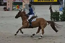 In April 2016, she won the Antwerp leg of the Global Champions Tour[25] ahead of another French rider, Simon Delestre, thanks to a triple clear round.[26] In June, Flora and her rider fell on an oxer during the jump-off at the CSIO5* (5-star international Olympic jumping competition) in Rotterdam.[27] Extensive veterinary examinations reveal no injuries or health problems, allowing Flora de Mariposa to remain in contention for the 2016 Summer Olympics.[28] The pair will compete at the Rio Olympics,[29] with the mare arriving on South American soil on the night of Sunday August 7.[30] Representing a reasonable medal chance for France,[31] she suffered a bout of colic on the evening of Friday August 12,[32] but recovered the following day.[33] During qualifying, the mare and her rider fell on an oxer, eliminating Pénélope Leprevost and Flora de Mariposa from the individual classes.[34] The mare and her rider nevertheless took part in France's team gold medal.[35]