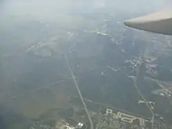 The intersection of SR 407 (thin line) and Interstate 95 (thicker line) seen from the air