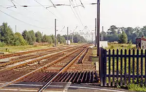Trains pass at speed on the electrified West Coast Main Line. The station platforms and all other buildings have been demolished, the pedestrian overbridge has also been removed, however the level crossing is still present.