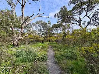 Citizen scientists have recorded 21 native bird species in the park.[6] This includes the Willie Wagtail, Purple-crowned Lorikeet and Spotted Pardalote, all of which are listed as “near threatened” at a regional level.[6][11] Sleepy lizards have also been recorded in the park, as well as the Small Grass Yellow Butterfly, which lays eggs on Senna artemisioides.[12][13] There are historical records of cockatiels and common bronzewings, but no recent sightings.[14][15]