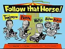Follow That Horse! is a 1960 British comedy film directed by Alan Bromly from a screenplay by William Douglas-Home. It stars David Tomlinson, Cecil Parker, Richard Wattis, Mary Peach and Dora Bryan.[1] Various parties including scientists and spies chase after a horse that has eaten a roll of microfilm.[2]