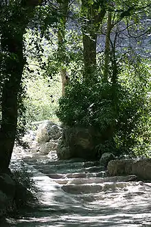 This karstification phenomenon acting on the surface of the impluvium, removes an annual volume of 45 cubic metres (1,600 cu ft) per square kilometre, which disappears after being dissolved in the water.[5] That figure becomes more meaningful when calculations show that, in 3.5 million years, the Vaucluse Mountains, the Albion Plateau, and the Lure Mountain, will have had their thickness reduced by 1,500 metres (4,900 ft).[6]