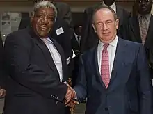 Zambia was key in facilitating talks between People's Movement for the Liberation of Angola (MPLA) and the National Union for the Total Independence of Angola (UNITA) of the Angolan Civil War.[30] The Angolan Civil War waged on from 1975 onward and involved massive foreign intervention in the face of the Cold War.[31] Initiated by Zambia, the Lusaka Protocol was a treaty that attempted to end the Civil War by disarmament and national reconciliation. The treaty was signed in Lusaka on 20 November 1994 and garnered international support, as well as support from Zimbabwean President Robert Mugabe and South African President Nelson Mandela.[32] Ultimately the fighting resumed, and by 1998, the peace process ceased.[33]