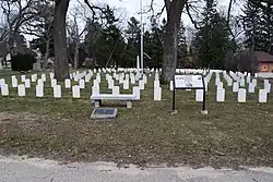 A section of the cemetery is known as Confederate Rest. On it lie about 140 Confederate prisoners of war who died while in confinement in a Union camp in Madison, Camp Randall,[6] in 1862.[7] A stone marker or cenotaph lists the names of 132[8] of the prisoners who died in custody. In October 2018, the Madison City Council voted 16 to 2 to remove the marker with the list of buried prisoners, overturning the Landmarks Commission, which had denied a permit to remove the marker,[9] which was built in 1906.[10] The eradication of the cenotaph was seen by some in city government as a "reparation,"[11] and was supported by the Equal Opportunities Commission of the city government.[12]