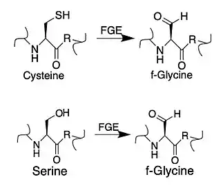 Formylglycine-generating enzyme (FGE), located at 3p26.1 in humans, is the name for an enzyme present in the endoplasmic reticulum that catalyzes the conversion of cysteine to formylglycine (fGly).[1] There are two main classes of FGE, aerobic and anaerobic. FGE activates sulfatases, which are essential for the degradation of sulfate esters. The catalytic activity of sulfatases is dependent upon a formylglycine (sometimes called oxoalanine) residue in the active site.[2]