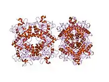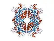 Ftr from the thermophilic methanogen Methanopyrus kandleri (which has an optimum growth temperature 98 degrees C) is a hyperthermophilic enzyme that is absolutely dependent on the presence of lyotropic salts for activity and thermostability. The crystal structure of Ftr, determined to a reveals a homotetramer composed essentially of two dimers. Each subunit is subdivided into two tightly associated lobes both consisting of a predominantly antiparallel beta sheet flanked by alpha helices forming an alpha/beta sandwich structure. The approximate location of the active site was detected in a region close to the dimer interface.[1] Ftr from the mesophilic methanogen Methanosarcina barkeri and the sulphate-reducing archaeon Archaeoglobus fulgidus have a similar structure.[2]