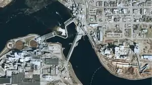 ![]() Satellite view of the bridge, on the right. A power dam is on the left. | |