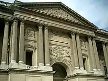 France Crowning Art and Industry (French: La France couronnant l'Art et l'Industrie) is a 6.50 m (21 ft) tall[1] limestone sculpture group which decorated the top of the entrance of Palais de l'Industrie, the main building of the 1855 international exhibition in Paris. It was moved to the park of Saint-Cloud in 1900 when the Palais de l'Industrie was demolished. The center group, composed of the three allegories (France, Art and Industry) is a work by sculptor Élias Robert. The two putti groups located on its sides are by Georges Diebolt. The wreaths France was carrying in her hands and most of the rays of the radiant crown she wears have been lost.
