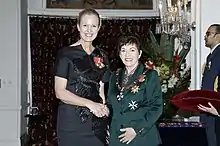 Valintine (left) in 2018, after her investiture as a Companion of the New Zealand Order of Merit by the governor-general, Dame Patsy Reddy