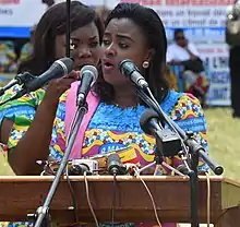 Muyumba was elected president of the Panafrican Youth Union (PYU) in 2014.[7] The PYU functions as the elected representative body for all African youth (defined as those under 35 years of age)—a demographic that consists of 65 percent of Africa's population.[8] During her tenure as president of the PYU, Muyumba strengthened the relationship with the African Union Commission, in order to bring African youth to the center of decision making; and facilitated intergenerational communication and the inclusion of youth voices in political matters across Africa.[9] She serves as the primary representative of youth issues to the African Union and associated heads of state. Muyumba worked with the African Union chairwoman Nkosazana Dlamini-Zuma to establish continental youth development funds.[10][11]