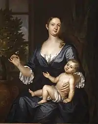 The next year, Brinley commissioned Scottish-born painter John Smibert, who had accompanied Berkeley to North America, to paint portraits of both himself and his wife and child.[1] Smibert's portrait of Brinley depicted both Queen Anne style furniture that he owned and Brinley's landholdings; the portrait Smibert made of Deborah and her son Francis depicted a small orange tree she owned, an expensive rarity in North America.[5] Lovell argued that given Brinley's wealth and European connections, "[it was] not surprising... that Brinley was one of Smibert's first customers".[8]