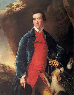 In 1762–63, Joseph Wright of Derby exhibited a set of six portraits that were commissioned by Mundy. Each of the portraits subjects were dressed in the attire of the Markeaton Hunt, which consisted of yellow breeches and a blue coat over a scarlet waistcoat. These paintings were hung at Markeaton Hall.[3] The subjects of these commissions included old school friends like Harry Peckham and relatives like his brother-in-law, Francis Burdett.