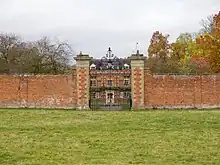 Gates at Ragley Hall displaying arms of 1st Baron Conway impaling those of his third wife Charlotte Shorter