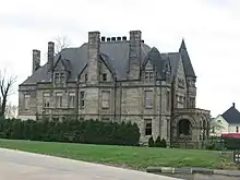 The mansion was built in 1891 for the Buhl family, which owned the Sharon Iron Works. The ashlar sandstone residence has 2+1⁄2 storeys. Noted Youngstown architect Charles Henry Owsley (1846–1935) designed it in the Richardsonian Romanesque style. The mansion features round arches, steep gable wall dormers, an inset porch with heavy arches, stone finials, and several turrets with copper capped spires. Although the house had been converted to apartments, it was restored. It currently operates as a bed and breakfast and wedding venue.[2][3][4]